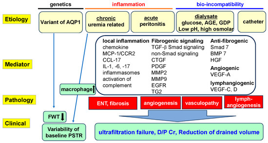 Summary of the etiology, mediators, and pathologies responsible for peritoneal membrane changes and dysfunction. The pathogenesis of peritoneal fibrosis is attributed to a combination of bioincompatible factors including AGEs, GDPs, pH, and high glucose concentration in PDF and catheter, along with peritonitis (particularly recurrent episodes of peritonitis). Uremia is associated with inflammation of the peritoneal membrane before PD initiation. AQP1 variants and peritoneal inflammation are related to variability in the UF volume at initiation of PD. Several kinds of mediators are involved in inducing phenotypic changes in mesothelial cells as epithelial–mesenchymal transition, leading to fibrosis associated with angiogenesis and lymphangiogenesis. Vasculopathy develops, particularly with the use of acidic conventional solution. UFF and peritoneal membrane dysfunction progress over time, particularly in patients (except children) treated with conventional PDF. AGEs: advanced glycation end products; AQP1: the gene that encodes aquaporin-1, GDPs: glucose degradation products; BMP7: bone morphogenetic protein 7; CCL: C-C motif chemokine ligand; CCR2: C-C chemokine receptor 2; CTGF: connective tissue growth factor; D/P Cr: dialysate-to-plasma ratio of creatinine; EGFR: epidermal growth factor receptor; FWT: free water transport; HGF: hepatocyte growth factor; IL: interleukin; MCP-1: monocyte chemoattractant protein-1; MMPs: matrix metalloproteinases; PDGF: platelet-derived growth factor; PSTR: peritoneal solute transfer rate; Smad: Suppressor of mothers against decapentaplegic; TGF-β: transforming growth factor-β; TG2: transglutaminase 2; VEGF: vascular endothelial growth factor. ↑: increase, ↓: decrease.