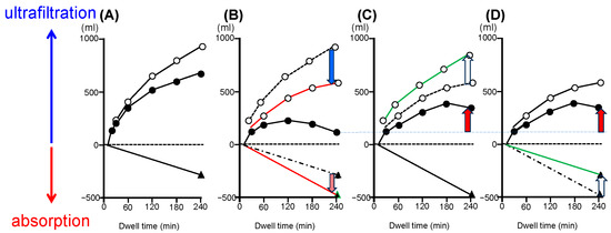 Determinants of ultrafiltration volume in PD. (A) Normal: Net ultrafiltration volume (black circle) is defined as transcapillary water transport (white circle) minus lymphatic absorption (black triangle). (B) UFF: After severe peritonitis, net ultrafiltration (black circle) decreases with a decline in transcapillary water transport (red line with blue arrow) and an increase in lymphatic absorption (red line with red arrow). (C) Suppression of angiogenesis against ultrafiltration failure: Suppression of angiogenesis (green line with white arrow) increases the drained volume (red arrow). (D) Suppression of lymphangiogenesis against ultrafiltration failure: Suppression of lymphangiogenesis (green line with white arrow) increases the drained volume (red arrow). Black dashed line indicates the baseline (ultrafiltration volume = 0 mL). Blue dashed line indicates the ultrafiltration volume at 240 min of dwelling time of (B).