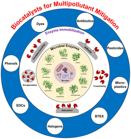 Schematic of immobilized biocatalysts derived from specific microbes for targeted multipollutant degradation.