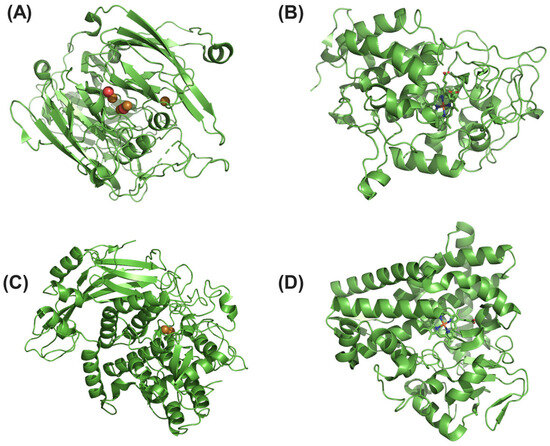 Three-dimensional structures of microbial oxidoreductase enzymes. The selected microbial oxidoreductases are (A) Bacillus subtilis CotA laccase (PDB ID: 1GSK); (B) Phanerochaete chrysosporium lignin peroxidase (PDB ID: 1B85); (C) one subunit of Agaricus bisporus tyrosinase (PDB ID: 5M6B); and (D) cytochrome P450 monooxygenase from Streptomyces scabiei (PDB ID: 8Q5J).