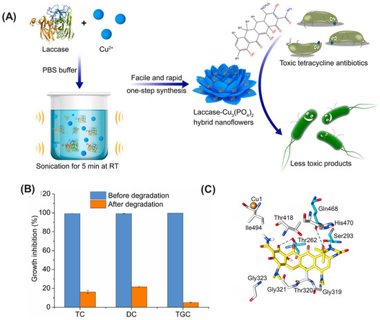 Han et al. investigated the application of immobilized laccase in the form of laccase-inorganic hybrid nanoflowers (Lac-hNFs) for the degradation of tetracycline antibiotics (TCs), an area previously lacking extensive exploration (Figure 5) [199]. Lac-hNFs were rapidly fabricated using a sonication method and demonstrated significantly enhanced thermal and storage stability compared to the free enzyme. Notably, Lac-hNFs exhibited superior performance in degrading a variety of TCs, including tigecycline, which has not been previously reported for laccase treatment. When employed in conjunction with acetosyringone as a mediator, Lac-hNFs efficiently removed over 79% of the TCs within an hour. Furthermore, Lac-hNFs displayed remarkable reusability, maintaining a high degradation capacity after multiple cycles. Importantly, the study confirmed a significant reduction in TC toxicity following Lac-hNF treatment, suggesting its potential application in environmental remediation efforts. The research also identified the main transformation products of the TCs and proposed degradation pathways. Additionally, molecular docking simulations provided valuable insights into the interaction between laccase and TCs. All TCs docked into a similar pocket near the enzyme’s copper center, with tigecycline exhibiting the strongest binding affinity, which aligns with the observed degradation efficiencies. This finding suggests potential avenues for future enzyme engineering endeavors aimed at further enhancing laccase’s efficiency in antibiotic degradation. Overall, this work highlights the significant impact of Lac-hNFs in immobilizing laccase for the effective removal of antibiotic pollutants from the environment.