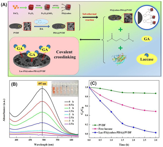 - Zhu, Y.; Qiu, F.; Rong, J.; Zhang, T.; Mao, K.; Yang, D. Covalent laccase immobilization on the surface of poly(vinylidene fluoride) polymer membrane for enhanced biocatalytic removal of dyes pollutants from aqueous environment. Colloids Surf. B Biointerfaces 2020, 191, 111025. [Google Scholar] [CrossRef] [PubMed]