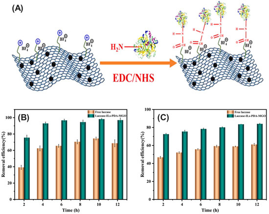 - Zhou, W.; Zhang, W.; Cai, Y. Enzyme-enhanced adsorption of laccase immobilized graphene oxide for micro-pollutant removal. Sep. Purif. Technol. 2022, 294, 121178. [Google Scholar] [CrossRef]