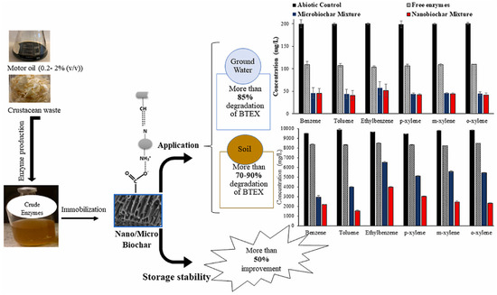 - Miri, S.; Perez, J.A.E.; Brar, S.K.; Rouissi, T.; Martel, R. Sustainable production and co-immobilization of cold-active enzymes from Pseudomonas sp. for BTEX biodegradation. Environ. Pollut. 2021, 285, 117678. [Google Scholar] [CrossRef] [PubMed]
