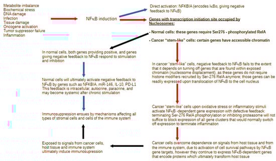 Therefore, the assortment of signaling modules in cancer and stromal cells determines the effects of cell stress and inflammatory gene expression. Especially in regard to cancer stem-like cells, inflammation has the natural effect of restraining their growth and activating immune responses; however, this depends on the degree of cancer stem cell adaptation and the immune modulators expressed. Evidently, in relapse and in cancer refractory to treatment, these natural mechanisms are overridden by modules that become available by chromatin unfolding. The degree to which cell stress and NFκB can restrain tumor growth depends on the degree to which their networks are connected to tissue homeostasis [27].