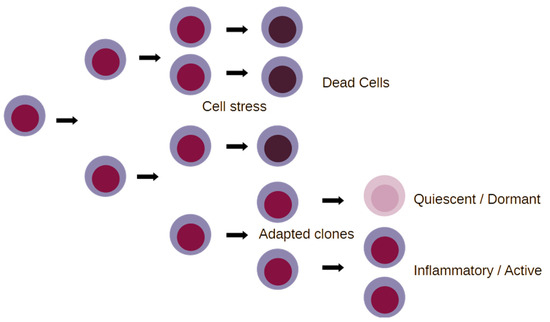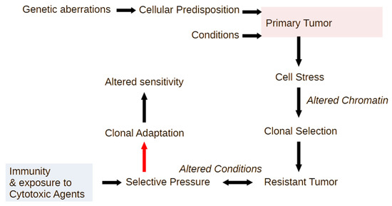 A divergent response to cell stress characterizes malignant cells and shapes the pool of surviving malignant clones after changes in the conditions of their microenvironment. This phenomenon is especially evident in recurrent cancer. An additional reason why this is important lies in the fact that by proliferating, cancer cells gain the capacity to generate more phenotypically or genetically diversified clones (red arrows). By increasing clonal diversity, cancer becomes difficult to eradicate.