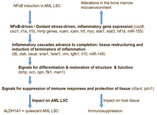 While AML cells may activate NFκB beyond the normal limits that are dictated by tissue function, their constitutive secretion of inflammatory mediators can lead to the inhibition of NFκB in immune cells, due to physiological negative feedback, impairing T-cell effector function [190]. This has negative effects on the disease course. In favorable AML, the leukemia cells are largely dependent on mediators secreted by cytotoxic CD8 T cells for signals activating stemness, cell proliferation and cell survival, immune-related signaling, and growth factor signaling. However, in unfavorable AML, leukemia cells develop autocrine signaling pathways and grow independently from CD8 T cells [190], which apparently paves the way for disease worsening.