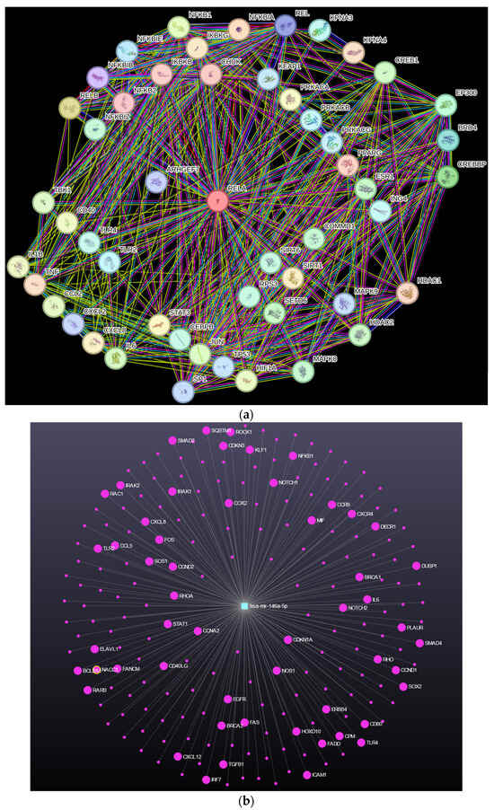 Illustrating the complexity of feedback mechanisms helps understand the depth of the impact of inflammation in cell signaling, which affects both conditions within the cell, as well as between the cell and its surrounding tissue. (a) A selection of “high-confidence” interacting proteins/genes with NFκB p65 (RelA) obtained with the platform string (https://string-db.org/, accessed on 6 July 2024). Details are clarified in the Supplementry Materials Figure S1. (b) An example of a key NFκB feedback gene is the micro RNA species miR146. This gene is prospectively associated with numerous other genes that influence cell stress responses (such as SQSTM1), inflammation (such as CXCL8), and cell phenotype (such as TGFβ1). Source miRNet 2.0 (https://www.mirnet.ca/, accessed on 6 July 2024).