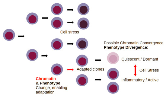 This means that cells during relapse have a chromatin state that enables substantial flexibility to respond to changes in the metabolic condition of host tissue, and this is clearly not limited to inflammatory genes, which are, however, a useful lead in the characterization of dynamic changes in cellular phenotypes. Therefore, the capacity of those cancer cells during relapse to react to challenging conditions is increased; this is mainly not due to a permanent genetic change (Figure 3).