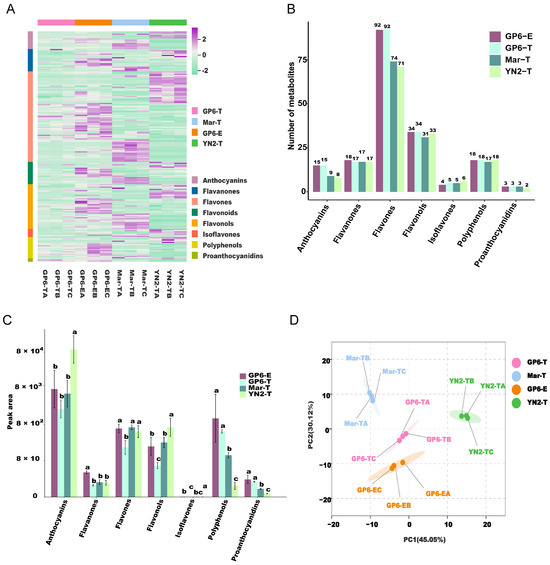 (A) Hierarchical cluster analysis (HCA). (B) The numbers of all groups of flavonoids in the four treatments. (C) The peak area of different groups of flavonoids. (D) Principal component analysis (PCA). Different letters indicate significant differences among samples according to Duncan’s test (p < 0.05).