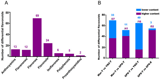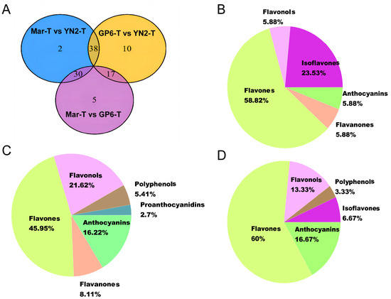 For GP6-T vs. YN2-T and Mar-T vs. GP6-T, 17 common DFMs were considered to be the key metabolites distinguishing GP6-T from YN2-T and Mar-T (Figure 3A). The key metabolites were 58.82% flavones, 23.53% isoflavones, 5.88% flavanones, and 5.88% anthocyanins (Figure 3B). In addition, 38 DFMs were shared by Mar-T vs. YN2-T and GP6-T vs. YN2-T, and the proportion of each class was 45.95% flavones, 21.62% flavonols, 16.22% anthocyanins, 8.11% flavanones, 5.41% polyphenols, and 2.70% proanthocyanins (Figure 3C). Thirty common DFMs were regarded as the major contributors to the variety variation between Mar-T vs. YN2-T and Mar-T vs. GP6-T, including 60% flavones, 13.33% flavonols, 16.67% anthocyanins, 6.67% isoflavones, and 3.33% polyphenols (Figure 3D).