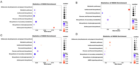 The differential metabolites of each comparison group were annotated using the Kyoto Encyclopedia of Genes and Genomes (KEGG) database. The above-mentioned annotated results were classified and enriched based on the pathway types in KEGG, and the enrichment results of each comparison group are shown in Figure 4. Based on the enrichment results, we observed that the DFMs of the comparison groups were mainly distributed in pathways including anthocyanin biosynthesis; the biosynthesis of phenylpropanoids; the biosynthesis of secondary metabolites; flavone and flavonol biosynthesis; flavonoid biosynthesis; stilbenoid, diarylheptanoid, and gingerol biosynthesis; isoflavonoid biosynthesis; and metabolic pathways (Figure 4). The flavonoid metabolites that caused the differences between YN2-T and GP6-T and Mar-T were significantly (p value < 0.05) enriched in anthocyanin biosynthesis (Figure 4A,C). When comparing Mar-T and GP6-T, the significantly enriched metabolic pathways were related to isoflavonoid biosynthesis (p value < 0.05) (Figure 4B). Metabolic pathways related to isoflavonoid biosynthesis and flavonoid biosynthesis were significantly enriched (p value < 0.05) when comparing GP6-T vs. GP6-E (Figure 4D).
