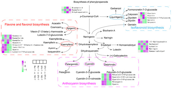 Based on the KEGG database, a flavonoid biosynthesis network containing 26 DFMs was constructed, with approximately three branches from p-coumaroyl-CoA (Figure 5).