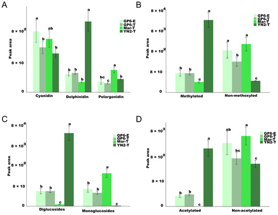 (A) Cyanidin, Delphinidin and Pelargonidin modified anthocyanins, (B) Methylated and Non-methoxyled modified anthocyanins, (C) Diglucosides and Monoglucoside modified anthocyanins, (D) Acetylated and Non-acetylated modified anthocyanins. The peak area of different modified anthocyanins among the four treatments. Different letters indicate significant differences among samples according to Duncan’s test (p < 0.05).