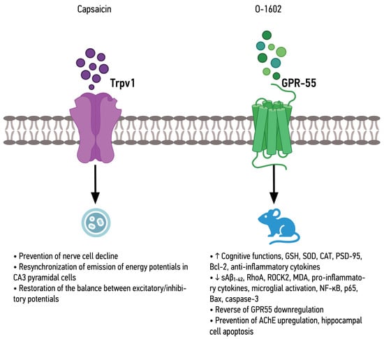 Thus, both approaches targeting Trpv-1 and GPR-55 demonstrated significant reductions in neuronal degeneration and cognitive impairments, although through different molecular pathways. The role of Trpv-1 and GPR-55 activation in reducing Aβ-induced impairments and cognitive deficits is established. However, the specific downstream signaling pathways and interactions with other receptors need further exploration.