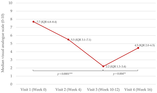 Disease severity (measured with visual analogue scale (VAS)) decreased from visit 1 (week 0) to visit 3 (at week 10–12 when NB-UVB was ended) (p < 0.0001). VAS increased from visit 3 to visit 4 (week 16, 4–6 weeks after cessation of phototherapy) (p = 0.004) (Figure 1).