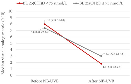 Patients with vitamin D deficiency or insufficiency (25(OH)D < 75 nmol/L), before phototherapy (visit 1 = week 0), had a significantly better response to treatment (measured with delta VAS) compared to patients with vitamin D sufficiency (25(OH)D ≥ 75 nmol/L), (p = 0.038) (Figure 2).