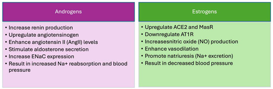 Sex hormones play a significant role in regulating the renin–angiotensin system (RAS). Androgens increase the expression of several components of the RAS [53]. They stimulate the synthesis of angiotensinogen, with studies showing that castrated male rats have a 60% lower Ang II mRNA levels compared to controls [140,141]. Additionally, testosterone upregulates angiotensinogen levels in the kidneys of male SHRs and Sprague Dawley and DS rats [140,142,143]. Furthermore, there is a linear correlation between testosterone activity and plasma renin activity, with males showing higher plasma renin activity compared to females [144,145]. Testosterone treatment of ovariectomized rats results in increased plasma renin activity, while castration decreases it [140]. Acute testosterone treatment also increases plasma aldosterone levels [146].