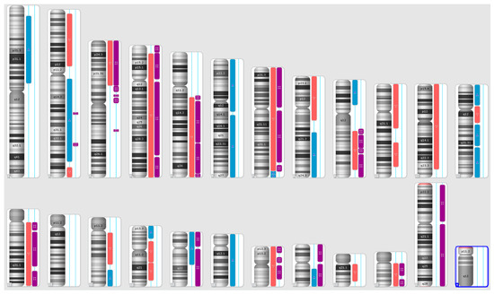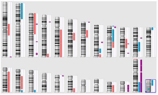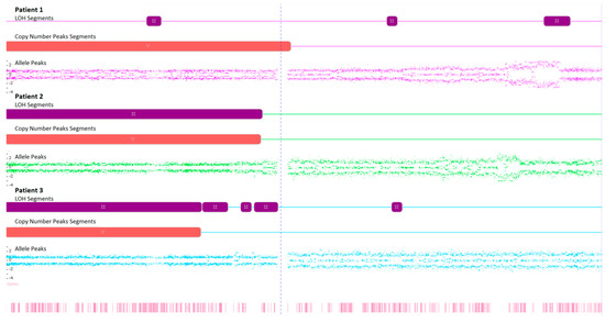 A karyoview depicting the identified genomic abnormalities (on the right side of each ideogram) in the cancer tissue of patient 3. Gains are represented by blue bars, losses are similarly depicted in red bars, and regions of loss of heterozygosity (LOH) are denoted by violet bars.