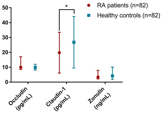 | Variable | Occludin (pg/mL) | Claudin-1 (pg/mL) | Zonulin (ng/mL) |