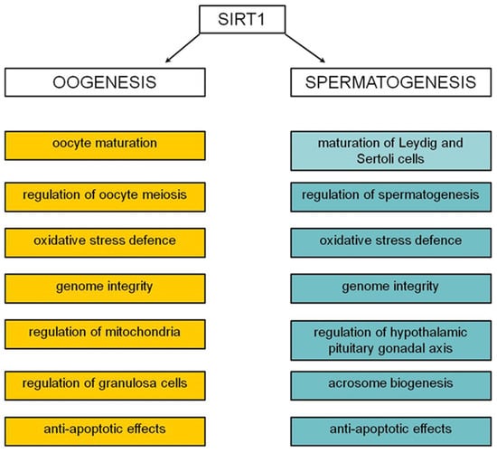 Oogenesis is also regulated via SIRT1 in numerous ways. Iljas et al. [] used the Sirt1−/− mouse model to demonstrate that the ovarian reserve and ability to produce mature oocytes were not affected by a SIRT1 deficiency but caused premature sterility in Sirt1−/− females compared to wild-type females. The authors propose that defects appear in elderly Sirt1−/− females due to age-related changes, such as reduced NAD+ and lower levels of sirtuins, which compromise mechanisms that can compensate for SIRT1 loss in younger oocytes. SIRT1 plays a role in meiosis progression. For instance, SIRT1 regulates a nuclear E2-related factor 2 (NRF2) that regulates cyclin B1 expression and is essential to oocyte maturation and spindle organisation []. During oogenesis, SIRT1 changes its localisation. Ferreira et al. [] revealed the nuclear presence of SIRT1 and SIRT2 in the germinal vesicle stage and the colocalisation of SIRT1, 2, and 3 with both metaphase-I and metaphase-II spindles. Nevoral et al. [] observed that spindle-specific SIRT1 action decreases α-tubulin acetylation and suggested that SIRT1 plays dual spatiotemporal action in oocytes, which can be readily switched from the epigenetic to the non-epigenetic mode of action according to the meiosis progress. Apart from regulating meiosis, SIRT1 protects oocytes against oxidative stress by promoting the activities of transcription factor FOXO3 and superoxide dismutase (SOD) []. In postovulatory oocytes, SIRT1 delays ageing by reducing the changes in histones’ H3K9ac, H3K4 methylation, ROS accumulation, spindle morphology, and mitochondrial functions []. The role of SIRT1 in regulating cells surrounding oocyte has been extensively studied. It was established that SIRT1 regulates granulosa cell differentiation and luteinisation [,] and affects mitochondria function. After SIRT1 silencing, Mitofusin-2 and Atg5 expressions, genes associated with mitochondria function, significantly decreased []. Han et al. [] demonstrated that SIRT1 protects granulosa cells against apoptosis by activating the ERK1/2 (extracellular signal-regulated protein kinase) and inhibiting nuclear factor NF-κB signalling pathways. Moreover, SIRT1 can directly regulate Bax and Bcl-xL expressions, proteins that regulate granulosa cell apoptosis [,] and apoptosis through the SIRT1/p53 axis []. Figure 2 summarises the most important SIRT1 functions in oogenesis and spermatogenesis.