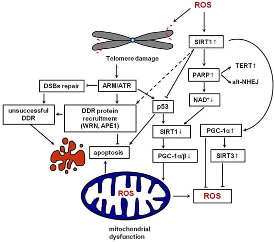 The interplay between telomeres and SIRT1 under oxidative stress. ROS leads to telomere damage and shortening, which activates ATM or ATR kinase. Kinases recruit DNA-damage-response proteins. In the case of unsuccessful repair, the cell undergoes apoptosis. The SIRT1 level rises under oxidative stress. SIRT1 also participates in the DNA damage response reaction by inducing PARP, which stimulates TERT and DNA repair via the alt-NHEJ mechanism. SIRT1 also delays apoptosis by inhibiting p53. The arrows indicate increasing or decreasing a given factor.