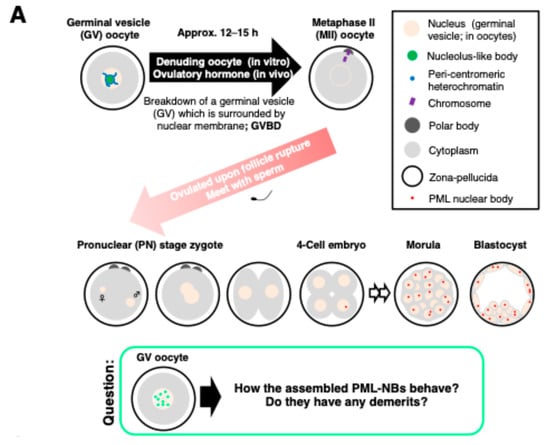 In the nucleus of a typical mammalian cell, there are structures called promyelocytic leukemia nuclear bodies (PML-NBs) with a diameter of about 0.2–1 μm. Microscopically, PML-NBs are often doughnut-shaped, and PML protein constitutes its shell. The inside of the shell is thought to contain more than 100 proteins (clients) [1]. PML-NBs are known to be involved in various reactions, including DNA damage response [2,3] and viral infection [4,5], depending on the clients. PML-deficient mice show immune system phenotypes such as leukopenia and reduced innate immunity [6,7], but no reproductive phenotypes have been reported, suggesting that PML plays an auxiliary role in reproduction. Given active fluxes of non-membranous organelles in the oocyte nucleus during growth, it remains curious as well as unclear why oocytes are devoid of specific membrane-less organelles such as Cajal bodies [8] and PML-NBs [9].