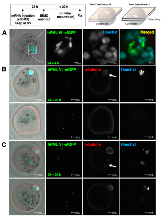 The integrity of the nuclear envelope can be maintained with the phosphodiesterase inhibitor IBMX (3-Isobutyl-1-methylxanthine), allowing GV oocytes enough time to translate the injected mRNA. To proceed to further stages, IBMX was removed from the culture media (in vitro maturation: IVM). At the stage of GVBD (4 h after removing IBMX), hmdPML-NBs were distributed in a location independent of the condensed DNA (Figure 2A). At 20 h after removing IBMX, spindles positive for α-tubulin antibody were formed not only on the polar body side but also within the oocyte cytoplasm. hmdPML-NBs were distributed in the cytoplasm independently of the location of these spindles, and they were not distributed around the condensed DNA (Figure 2B,C).