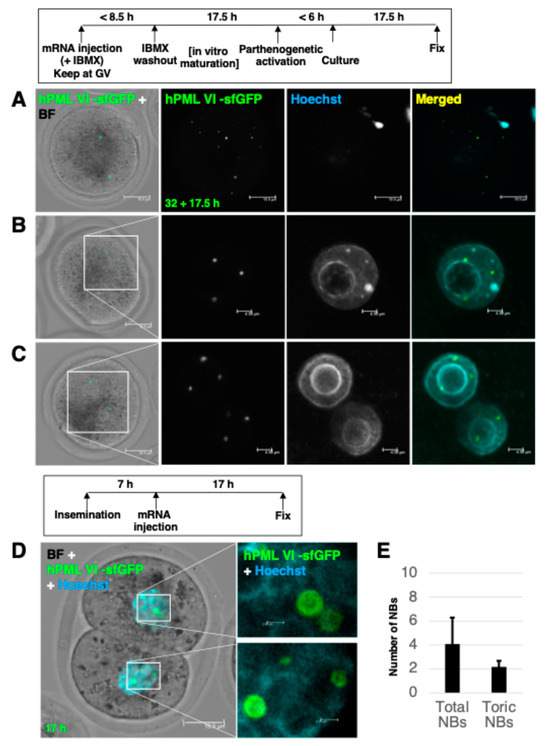 To obtain parthenogenetic embryos with PML-NBs, GV-oocytes were first collected from ovaries that were primed in advance with PMSG for 48 h. The oocytes microinjected with hPML VI -sfGFP mRNA were kept in GV-stage by 50 µM IBMX for 7–8.5 h. In vitro maturation was carried out and additionally supplemented with 25 µg/mL sodium pyruvate, 0.1 IU/mL PMSG, 1.2 IU/mL hCG, and 4 ng/mL EGF. Matured oocytes were further treated with 5 mM SrCl2 and 5 µg/mL cytochalasin in Ca2+-free M16 medium for up to 6 h to activate and diploidize, respectively. After the activation, oocytes were further cultured in KSOM-AA. To obtain preimplantation embryos with PML-NBs, after 7 h of insemination, embryos were washed out of sperm and microinjected with mRNA as described. Microinjected embryos were further cultured until the indicated embryonic stages in KSOM-AA.