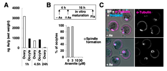 Oocytes (similarly collected as described above but on ice and washed thoroughly) or ovaries (and liver as a positive control) were collected on ice after indicated time courses after the intraperitoneal injection of saline (negative control) or 8 mg/kg bw sodium arsenite. Concentration of arsenic in ovary or oocyte was determined by ICP-MS (7500 cx, Agilent Tech., Santa Clara, CA, USA) after wet-ashing each biological samples with 600 µL of HNO3 and 200 µL of 30% H2O2 (HNO3:H2O2 = 3:1) under refluxing condition at 135 °C for 2 days. The samples were diluted with ultra-pure Milli-Q (MQ) water at a final volume of 5 mL for the ovary and 1 mL for the oocytes. The number of GV-oocytes used for detection was as follows: 1 h: 213–283 oocytes (7–9 mice); 4.5 h: 144.5–154 oocytes (7 mice each, a half of the volume analyzed); 24 h: 566 oocytes (13 mice). Total arsenic concentrations were measured in the normal mode (7500 cx; m/z 75: 75As+). Bovine liver (NIST, Gaithersburg, MD, USA) was used as the certified reference material (CRM). The analytical method was validated by measuring the arsenic concentration in the CRM. The estimation process for relative volumes of the ovary and oocyte was as follows. The ovary and oocyte were regarded as an oval sphere and a sphere, respectively. Ovary: major axis (M): 1918 μm; minor axis (m): 1095 μm; V = 4/3 π × 1/2 M × (1/2 m)2 = 4/3π × 959 × 547 × 547 ≅ 1.2 mm3. Oocyte: diameter (D): 90 μm; V = 4/3π × (1/2 D)3 = 4/3π × 45 × 45 × 45 ≅ 0.0004 mm3. V(Ovary)/V(oocyte) = 1.2/0.0004 = approx. 3000.