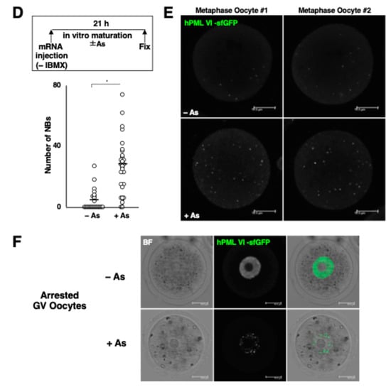 Considering the stress-responsive property of PML protein [19,20], we further analyzed the persistence of preassembled hmdPML-NBs in the cytoplasm of metaphase oocytes that are preparing for the pronuclear membrane reformation in the presence of arsenite. First, we confirmed that arsenic was taken up by oocytes by monitoring the decay time from arsenic administration (Figure 4A). Based on the observation that spindle formation was inhibited by 10 μM arsenite treatment but maintained at 3 μM (Figure 4B,C), IVM was performed in the presence or absence of 3 μM arsenite for 21 h. As a result, a greater number of preassembled hmdPML-NBs persisted in the cytoplasm than in the absence of arsenite (Figure 4D,E). Observation of GV-arrested oocytes that did not undergo GVBD is useful for inferring the efficiency of microinjection as well as the appearance during the GV stage of oocytes that successfully underwent GVBD. After 21 h of culture with arsenite, hPML VI -sfGFP was clearly accumulated as hmdPML-NBs in the nuclei of GV-arrested oocytes and was less distributed in the nucleoplasm than in the absence of arsenite (Figure 4F), indicative of the insolubilization in the nucleoplasm. It is generally believed that in the presence of arsenite, PML proteins in the nucleus are modified by SUMO distributed in the nucleus which mediates their degradation via SUMO-dependent Ubiquitin E3 ligase system [1]. When the culture was performed for 40 h, hmdPML-NBs were still found to remain in the cytoplasm even in the presence of arsenite (Figure S3A). On the other hand, in GV-arrest oocytes treated with arsenite, the disappearance of preassembled hmdPML-NBs was observed in many oocytes, with a few oocytes in which strongly aggregated hmdPML-NBs remained (Figure S3B). This suggests that the degradation system that potentially works well in the nucleus does not work sufficiently on preassembled hmdPML-NBs that have been dispersed in the cytoplasm after GVBD. Together, if oocytes retain PML protein in the nucleus in the form of NBs like typical somatic cells, it may become nuisance debris for pronuclear formation in the cytoplasm which could be enhanced under stress.