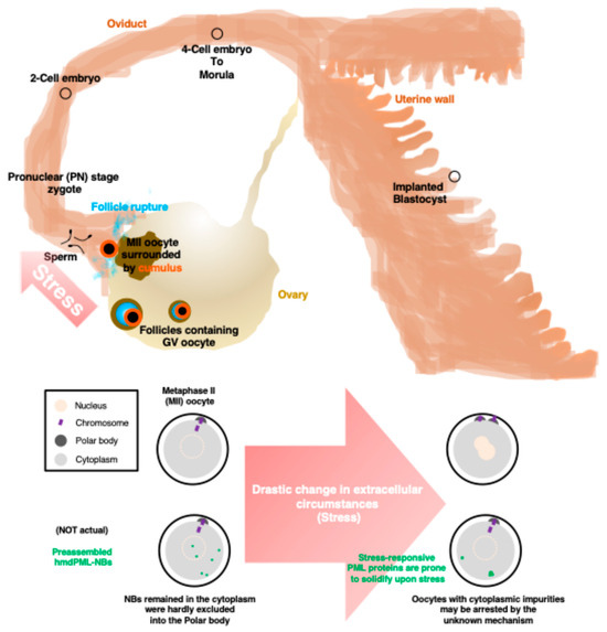 PML-NBs are thought to be non-membrane organelles that consist of a proteinous scaffold (PML protein) and clients. In the ovaries and fallopian tubes, oocytes/embryos undergo various types of stresses (Figure 5). Given that the impaired dynamics of non-membrane organelles with irreversible aggregate formation due to excessive or chronic stress are related to pathological conditions [21], it would be important to analyze the optimal timing of the emergence, abundance, and distribution of non-membrane organelles in the light of the physiological environment for the development of oocytes.