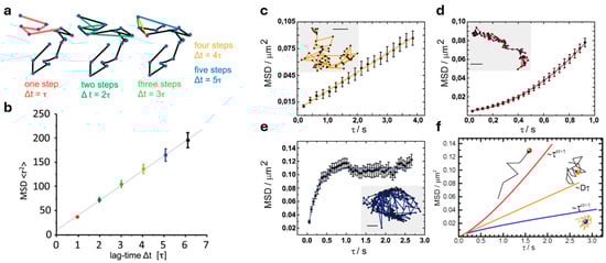 Mean Squared Displacement (MSD) analysis. (a) Different numbers of steps (different time lags) are considered for the MSD calculation. (b) The average of all displacements with the same time lag gives a point in the MSD curve. (c–e) The plot of MSD versus the time lag (τ) allows the classification of the type of motion for the trajectories (in the insets) showing Brownian (c), drifted (d), and confined (e) motion. (f) Examples of MSD behavior for superdiffusive (red line) and subdiffusive (blue line) “anomalous” motion, compared with the one for a Brownian trajectory (orange line). Bar in (c–e) insets: 0.16 μm. Panels (a,b) are adapted with permission from [] © 2011 The American Society of Gene and Cell Therapy, published by Elsevier Inc. Panels (c–e) are adapted with permission from [] © 2011 Elsevier B.V.