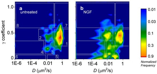 Bidimensional histograms of the γ coefficient (from the MSS analysis) versus the short-term diffusion coefficient D (from the MSD analysis) measured by SPT for the TrkA receptor (unstimulated in (a), stimulated by the nerve growth factor, NGF, in (b)). White rectangles numbered from 1 to 8 correspond to the different identified dynamic regions []. On the right the color bar shows the frequency of the total D-γ distributions in logarithmic scale and normalized to 1 at the peak. Reproduced with permission from [] (© 2013 The Company of Biologists Ltd.), permission conveyed through Copyright Clearance Center, Inc.