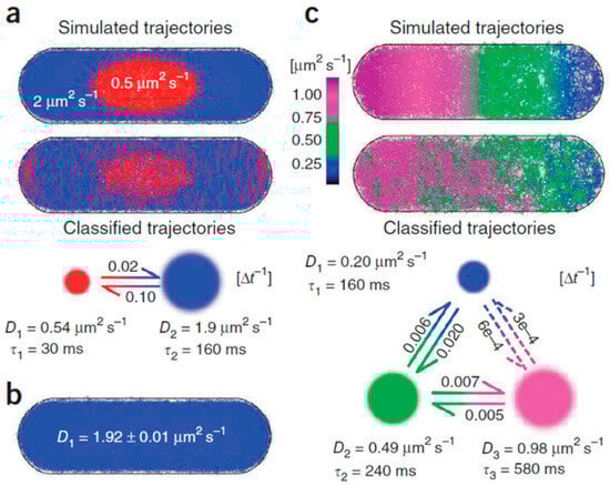 - Persson, F.; Lindén, M.; Unoson, C.; Elf, J. Extracting Intracellular Diffusive States and Transition Rates from Single-Molecule Tracking Data. Nat. Methods 2013, 10, 265–269. [Google Scholar] [CrossRef] [PubMed]