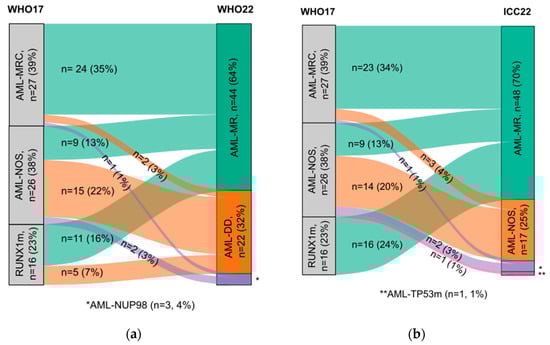 Alluvial plots showing the redistribution of cases according to new classifications. For each diagnostic category (squared boxes), the number of patients following the same classification is indicated in each flow path. (a) Reclassification of patients with acute myeloid leukemia (AML) from the World Health Organization Classification of Hematolymphoid Tumors published in 2017 (WHO17) to the version published in 2022 (WHO22); (b) reclassification of patients from WHO17 to International Consensus Classification of 2022 (ICC22). Other abbreviations: AML-MRC, AML with myelodysplasia-related changes; AML-NOS, AML not otherwise specified; RUNX1m, AML with RUNX1 mutation; AML-MR, AML myelodysplasia-related; AML-NUP98, AML with NUP98 rearrangement; AML-TP53m, AML with TP53 mutation.