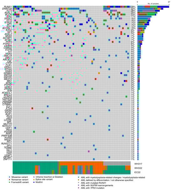 - Fuhrmann, I.; Lenk, M.; Haferlach, T.; Stengel, A.; Hutter, S.; Baer, C.; Meggendorfer, M.; Kern, W.; Haferlach, C. AML, NOS and AML-MRC as defined by multi-lineage dysplasia share a common mutation pattern which is distinct from AML-MRC as defined by MDS-related cytogenetics. Leukemia 2022, 36, 1939–1942. [Google Scholar] [CrossRef] [PubMed]