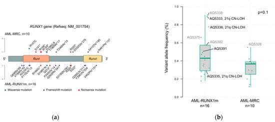 Oncogenic or likely oncogenic RUNX1 mutations found in 26 patients from the whole cohort. (a) Mutation type and location displayed according to WHO17 diagnostic category: AML-MRC (n = 10) (upper part) or AML-RUNX1m (lower part); (b) variant allele frequency (VAF) distribution of RUNX1 mutations for each diagnostic category. Cases with VAF > 50% are tagged in black (when copy-number analysis could be done on that sample) or in gray (when the copy-number analysis could not be performed). The three cases with 21q CN-LOH are also marked.