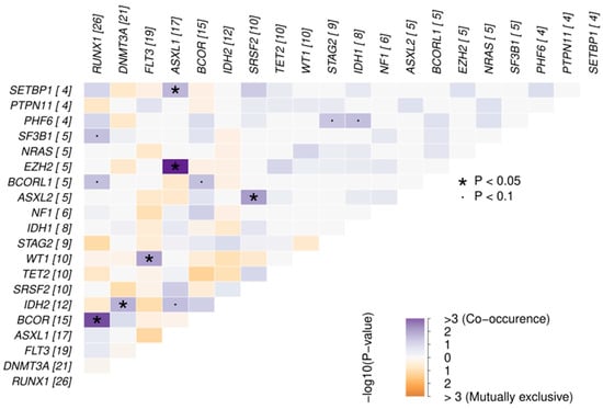 We explored the pairwise pattern of co-occurrence and mutual exclusivity of mutations in the 20 genes affected in at least four samples (Figure 4). Chromatin modifiers showed frequent associations with other MR genes (ASXL1-EZH2, p < 0.001; ASXL2-SRSF2, p = 0.02) and with myeloid transcription factors (BCOR-RUNX1, p = 0.002; ASXL1-SETBP1, p = 0.045). Mutated RUNX1 also co-occurred frequently with mutations in BCORL1 (p = 0.06) and SF3B1 (p = 0.06). Our cohort also showed other well-known co-occurrence patterns (FLT3-WT1, DNMT3A-IDH2). In contrast, no significant mutual exclusivity was found between any pair of genes.
