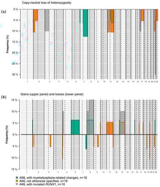 Gains and losses (shown in Figure 5b) frequently affected a higher number of chromosomal regions from the same patient and/or co-occurred with other CNAs. Trisomies were also restricted to 4 chromosomes (trisomy 8, n = 2; trisomy 13, n = 2; trisomy 6, n = 1 and trisomy 11, n = 1). In one case, a focal deletion of 2p involved DNMT3A mutation (VAF 91%), and, in another case, loss of 7q affected EZH2 mutation (VAF of 90%). CNAs were evenly distributed across the different diagnostic categories (Supplementary Tables S2–S4), except for CN-LOH on 21q, which was absent from AML-MRC.