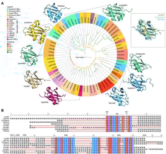 Ubiquitin-like proteins can be classified into two categories (Figure 1A): (i) ubiquitin-like modifiers (ULMs), which covalently attach to target molecules via their C-termini [,], and (ii) proteins containing a ubiquitin-like domain (UDPs), which are similar to ubiquitin in terms of sequence and structure [], but do not form conjugates with other molecules. Instead, they function by forming protein complexes or binding to their adaptor proteins []. The question of which is the primary entity in terms of ULM evolution—UDP or ubiquitin—remains open. Reconstruction of the evolutionary history of ubiquitin-like proteins based on bacterial and archaeal genomes indicates that the Last Universal Common Ancestor (LUCA) possessed genes encoding Ubl-binding proteins that recognize RNA [,]. Furthermore, it is hypothesized that the ubiquitin-like β-capture fold originated in the LUCA as an RNA-binding domain [,]. Despite the universality of the ubiquitination system, the representation of ubiquitin and Ubls differs between the genomes of different groups of organisms.