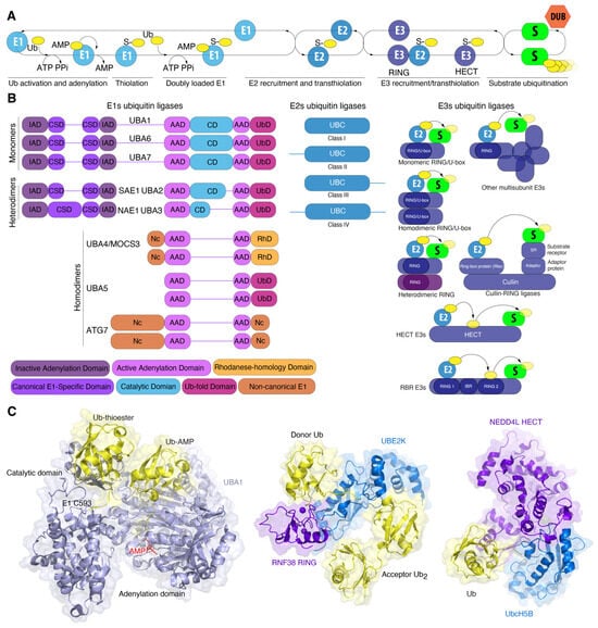 The enzyme E1 initiates the ubiquitination process (Figure 2A). E1 activates ubiquitin via its ATP-binding domain to form the intermediate product, ubiquitin-adenylate []. E1 simultaneously binds both ATP and ubiquitin, catalyzing the acyladenylation of the C-terminus of the ubiquitin molecule. In a subsequent step, ubiquitin is transferred to the cysteine residue in the active center, accompanied by the formation of a thioester bond between the C-terminal carboxyl group of ubiquitin and the cysteine sulfhydryl group of E1, releasing AMP. Next, the activated ubiquitin is transferred to the catalytic UBC domain of the ubiquitin-conjugating enzyme E2. The specific binding of ubiquitin to the substrate is carried out by ubiquitin E3 ligase enzymes. E3 ubiquitin ligases consist of two distinct enzyme types. Firstly, those with a RING domain bind to E2 and the substrate, bringing them into close proximity for the transfer of ubiquitin to the substrate, a process catalyzed by the E2 enzyme. Secondly, ubiquitin ligases with a HECT domain (HECT ligases) and a TRIAD domain (RBR ligases) are directly involved in the transfer of ubiquitin to the ε-NH2 group of lysine residues of the substrate, forming an isopeptide bond. Additionally, these ligases catalyze the transfer of ubiquitin to the α-amino N-terminal group, to serine, threonine, or cysteine residues of the substrate, forming ester or thioester bonds with substrate proteins. Finally, ubiquitin moieties may be removed by deubiquitinating enzymes (DUBs), which can completely or partially detach ubiquitin chains from the substrates.