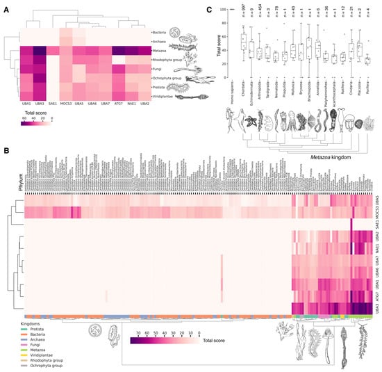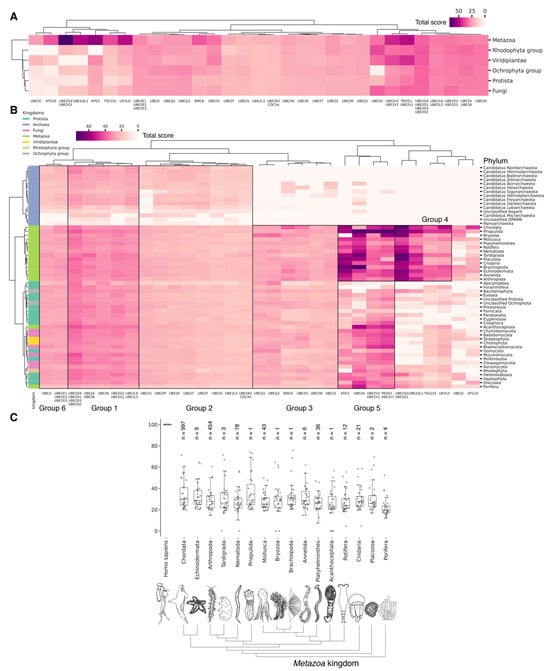 Hierarchically clustered heat map with total score values for E2 activating enzymes classified by phyla (A) and kingdoms (B) with indication of E2 group boundaries for functional analysis using the Gene Ontology database (https://geneontology.org/, (accessed on 3 May 2024) []), (Supplementary S5_1–S5_8). (C) Boxplots by total score values of E2 activating enzymes for Metazoa kingdoms. Each dot represents average value for unique E2 (or group of highly homological E2) among analyzed phylum representatives. Normalized values (0–100) characterize the proximity of catalytic domains of E2 ubiquitin ligases to human representatives. For each phylum, the median and interquartile values are given. Bars represent standard deviations. Count of individual analyzed genomes is indicated (n).