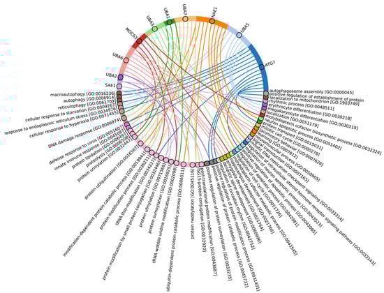 Chord diagram for human E1 enzymes showing the relationship of the proteins to the Gene Ontology biological pathways in which these proteins are involved.