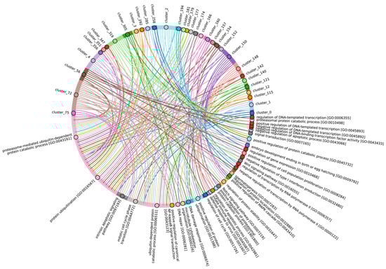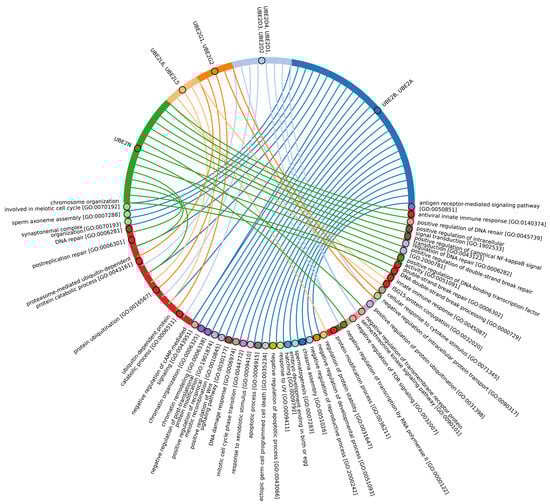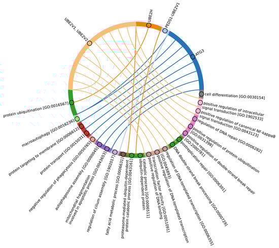 Chord diagram illustrating the relationship between the E2 enzyme group 3 and their associated Gene Ontology biological pathways (Supplementary Table S5_3).