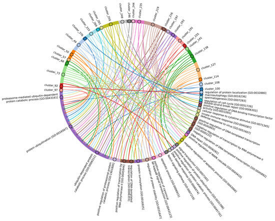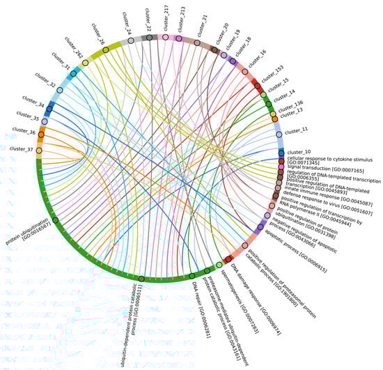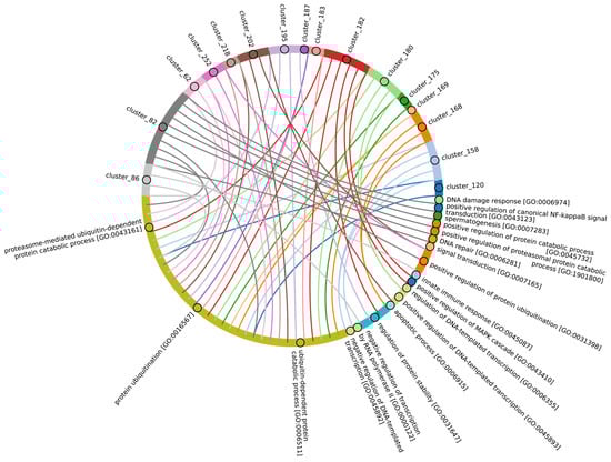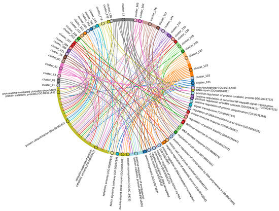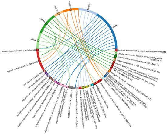 Chord diagram illustrating the relationship between the E2 enzyme group 5 proteins and their associated Gene Ontology biological pathways (Supplementary Table S5_5).