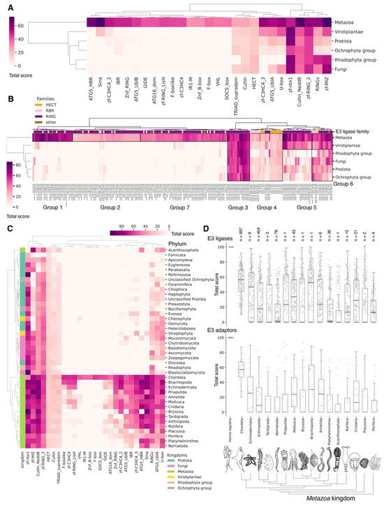 Hierarchically clustered heat map with total score values for domains (A,C) and clusters (B) of E3 ligases classified by phyla (A,B) and kingdoms (C). Groups marked on panel (B) indicate E3 boundaries to assess the relationship to Gene Ontology biological pathways in which proteins containing these clusters are involved. In panels (A,C), we used median of total scores for groups of clusters belonging to distinct domains. In panel (B) and Figure S3, the total scores for clusters of E3 ligases and adapter proteins were used. Normalized values (0–100) characterize the proximity of functional domains or clusters of E3 ubiquitin ligases to human representatives. (D) Boxplots by total score values of E3 ligases and adapter proteins clusters for Metazoa. Each dot represents average value for unique cluster among analyzed phylum representatives. For each phylum, the median and interquartile values are given. Bars represent standard deviations. Count of individual analyzed genomes is indicated (n).