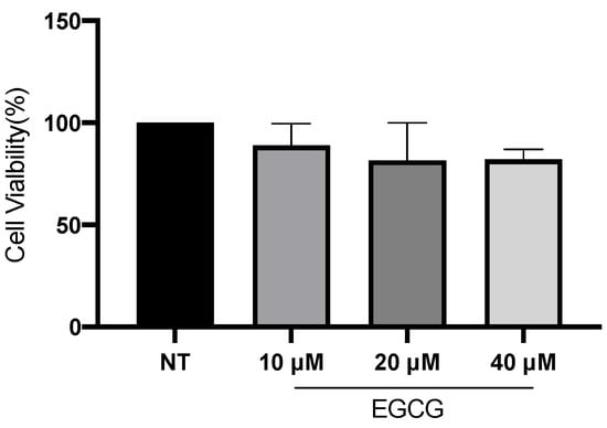 A-431 cell viability evaluated by MTT assay 24 h after EGCG treatments. Each experimental group was compared with its respective control (NT). Values of p < 0.05 were considered statistically significant. Data are expressed as mean ± SD of three biological replicates.