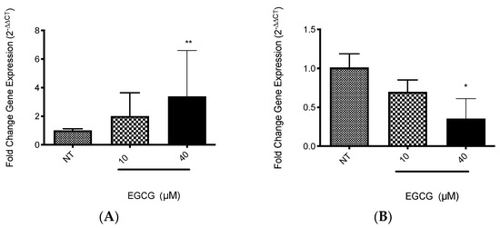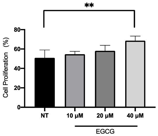 Proliferation assay of A-431 cells incubated with 10 µM, 20 µM and 40 µM EGCG for 4 h. Each experimental group was compared with its respective control (NT). Values of p < 0.05 were considered statistically significant. ** p < 0.01. Data are expressed as mean ± SD of three biological replicates.