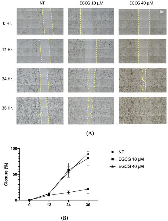 Wound healing assay of A-431 cells incubated with 10 µM and 40 µM EGCG. (A) Representative images of wound healing assay using an objective with 20× magnification. (B) Percentage of wound closure. Each experimental group was compared with its respective control (NT). Values of p < 0.05 were considered statistically significant. Data are expressed as mean ± SD of three biological replicates.